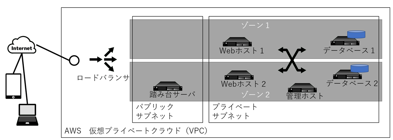 AWSのロードバランサはプロキシ機能を有しており、NAT(本図では省略)と合わせて冗長化構成を実現する。