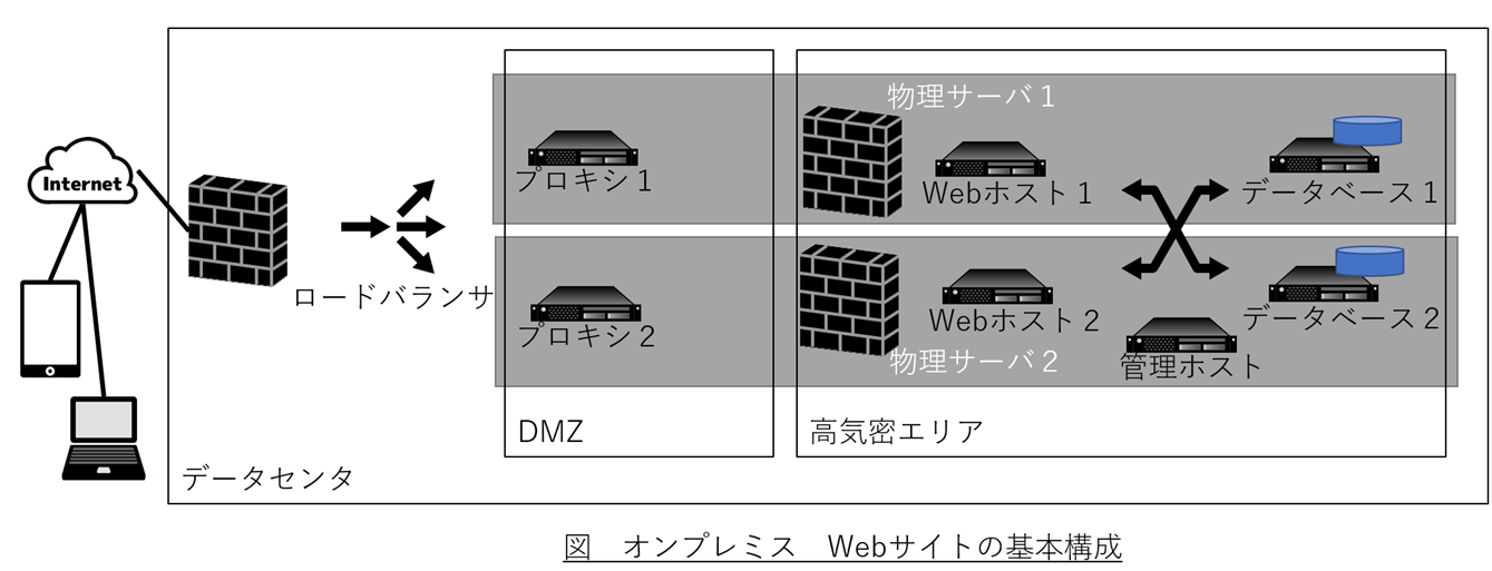 オンプレミスのWebサイトでは、FWでDMZと高機密エリアを構成し、それぞれを物理サーバで冗長化して構成する(下図)。